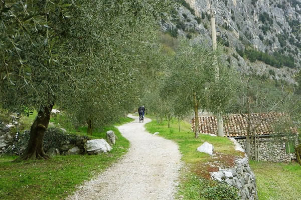 This tour is for those who want to go beyond the natural borders of the “Busa”, literally the “hole” meaning the hollow in which the towns of Arco, Torbole and Riva del Garda lie, exploring the Sarca river valley up to Dro. This safe and comfortable route is mainly on level terrain; it passes on the local network of bicycle lanes and some asphalt country roads and is also suitable for those who have no experience with mountain bikes. On our way back part of the route will be on a dirt road surrounded by pines first and olive trees later, before meeting the Sarca river and following it to its mouth in the Garda lake. We will make a stop halfway into the tour, at Lake Bagatoli: a small pearl surrounded by a beautiful pinewood at the foot of the tall Brento rock face, a haven for the most experienced rock climbers and daring base jumpers.